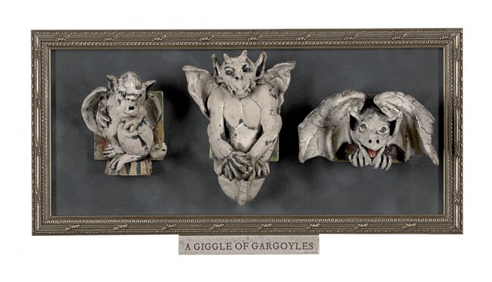 The first true gargoyles appeared in Ancient Egypt and in France in the 13th century. The word gargoyle is derived from the French word gargouille, meaning gullet or throat. A true gargoyle is a functioning rainspout, while solely decorative architectural beasts are referred to as chimeras or grotesques. They were intended to strike the fear of Hell into the Church’s mostly-illiterate parishioners. Placed on a cathedral’s exterior wall, they reinforced the idea that evil dwelt outside and salvation was within. I totally made up “giggle” as the collective noun.