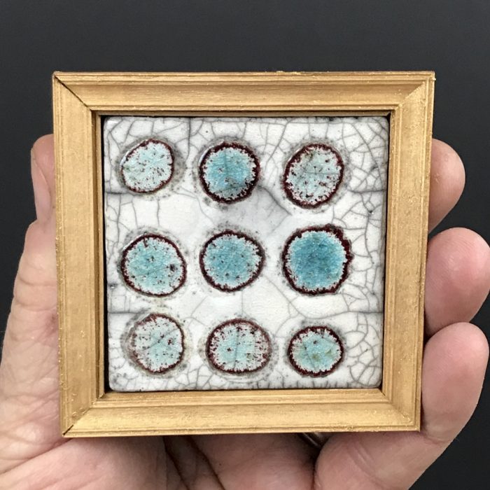 For the Modique Fire Paintings, I paint with glaze onto the 2 inch bisque tile and then let the raku process do the rest. Finished tiles are placed into wooden frames. I hand-make each frame from miniature doll house trims – 3 different designs glued together to create the final style and then each is hand-painted.